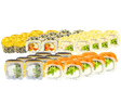 Склад: філадельфія з лососем, чіз рол, спайсі чікен, каліфорнія з крабом, ніжний з сиром.